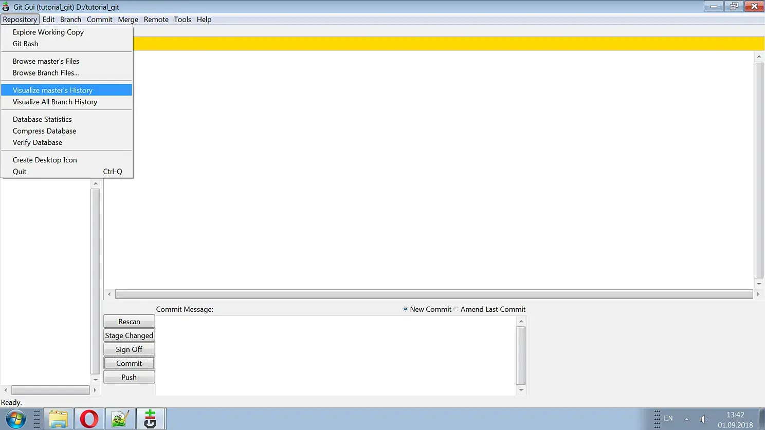 Надо нажать кнопку «Commit», второй шаг будет успешно завершен. Чтобы посмотреть, что сейчас произошло, можно открыть на панели меню «Repository – Visualize master’s History» (либо пукнт ниже «Visualize All Branch History»)