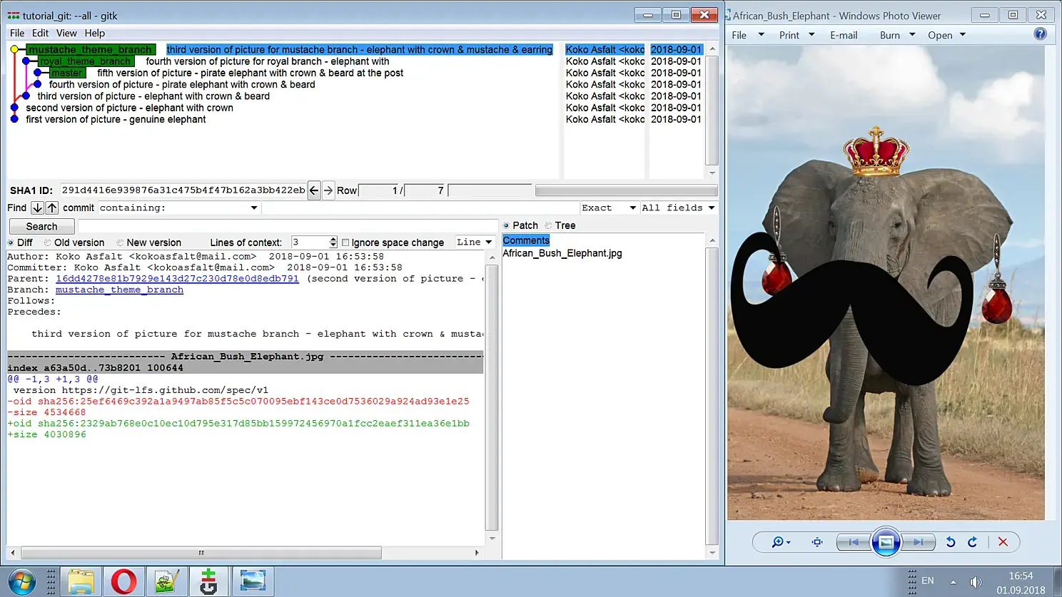 Желтый круг в интерфейсе сменил расположение: это значит, что текущей веткой является royal_theme_branch. Изображение вернулось на третью версию. Делаем доработки для картинки. Вносим изменения в систему контроля версий.
