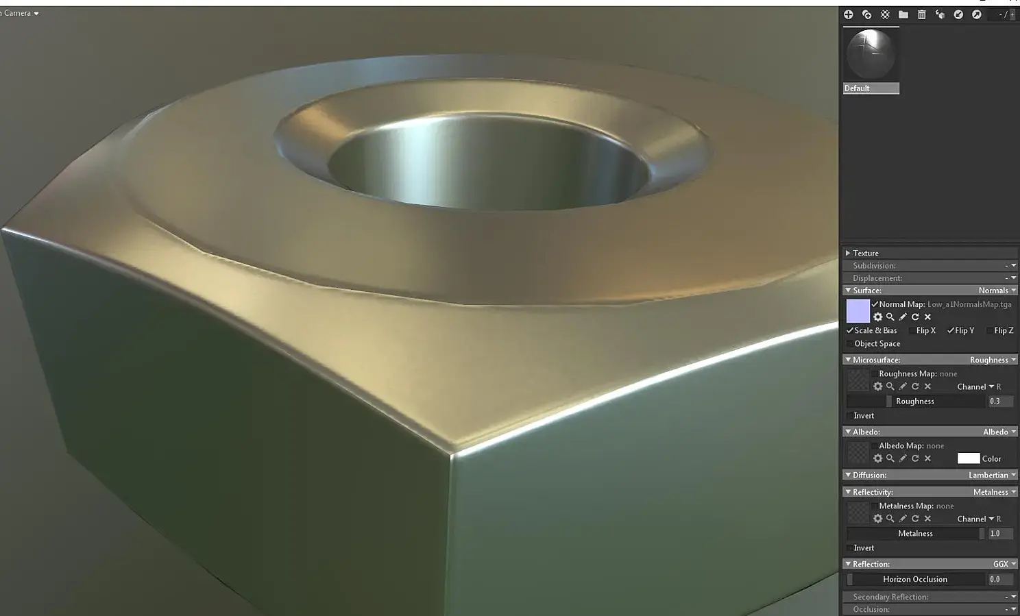 Теперь эксперемента ради рассмотрим третий способ возьмём третью гайку Low_a2, повторим действия с хард эджами и накинем на неё развёртку от гайки Low, что получится? И так ли важна развёртка?