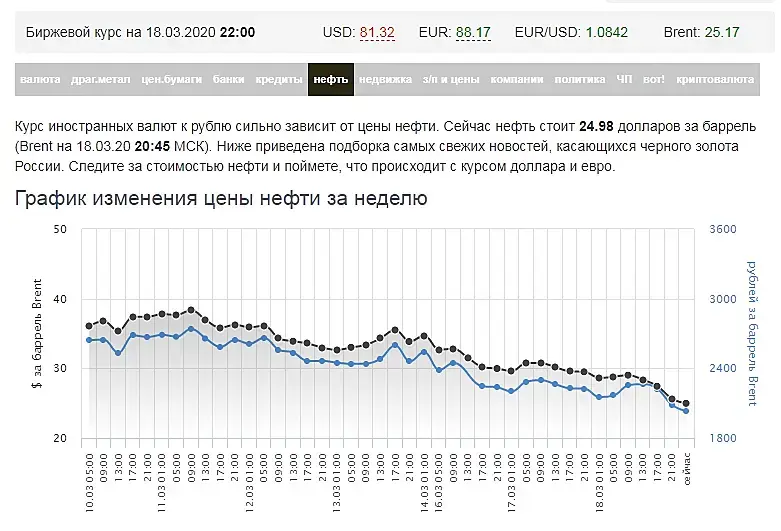 С одной стороны Covid-19 , а с другой нас добивает цена на нефть , она стремительно падает. Уже сейчас меньше 25$ за барель ! это рекорд господа(( . Что будет завтра никому не известно , но сейчас уже больно смотреть на рубль . У кого какие прогнозы по поводы цены на нефть ?