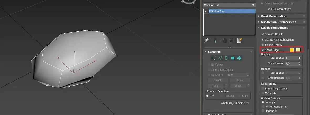 Создаю бокс затем Convert to edit poly>use NURMS Subdivision>comvert to edit poly. Он добавляет точки и грани тоже, но не отображает их и не дает их выделить.