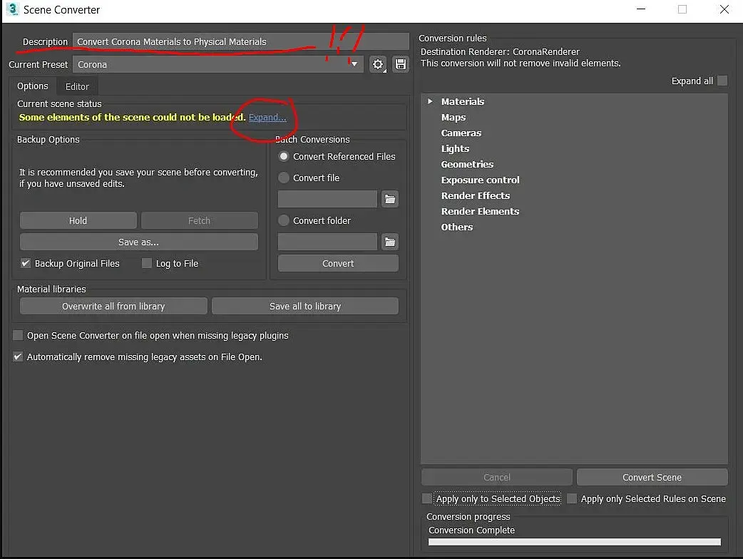 Надеюсь, прочитали, что конвертер конвертирует ИЗ короны в физикал. И его не надо запускать. По идее, не должен включаться со снятой галкой "Open scene converter...@