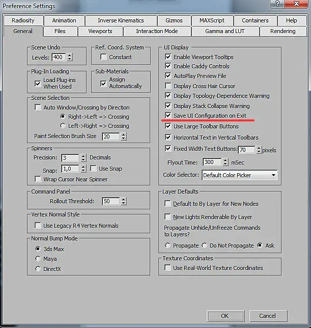 снова поставил галку в чек боксе - Save UI Configuration on Exit, вышел, нажав ОК.