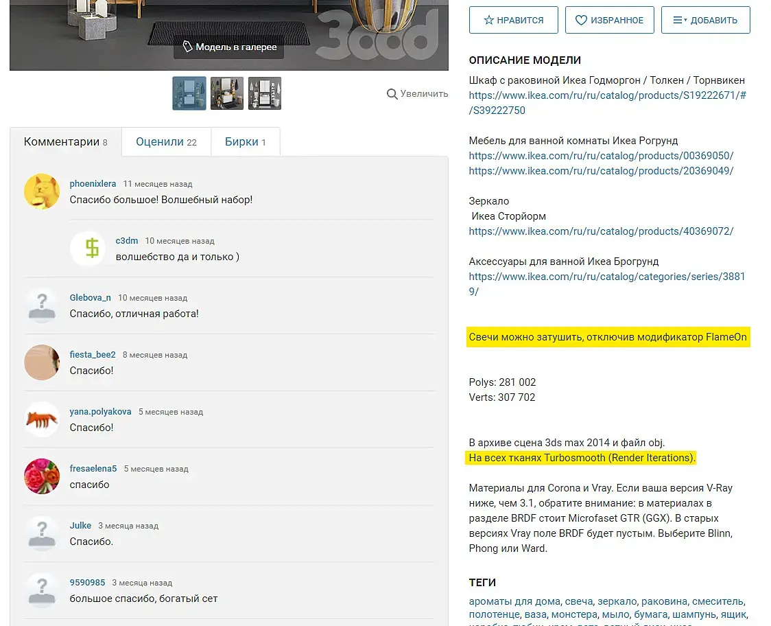 Я ещё год назад об этом писал, что техническую информацию, про фур, совместимость версий рендера, про всевозможные сглаживания и т д ..... . Нужно выносить в отдельный пункт отделить цветом/тоном и какой нибудь значок обозначающий "внимание" . И при загрузке модели для этой информации отдельное поле, для описания своё, для тех. инфы своё. Тогда покупатели не будут сетовать "верните мои деньги, на модель турбосмуз не накинули " если в описании это указано .