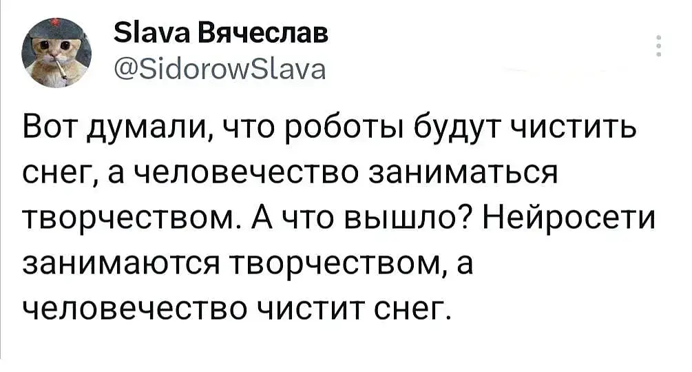 Никто не задумывался что скоро тысячи лет человеческих достижений в искусстве будут казаться примитивной мазнёй ребенка. ИИ уже может лучше рисовать картины чем любой художник за всю историю, уже дышит в спину композиторам и певцам, потом будет кино и актёры и так далее. ИИ обесценивает труд человека. Наши потомки будут считать ИИ совершенным, идеальным. Может даже поклоняться начнут ему? А что, если подумать то он бессмертен, он всевидящий, он вездесущ, Он всемогущ.