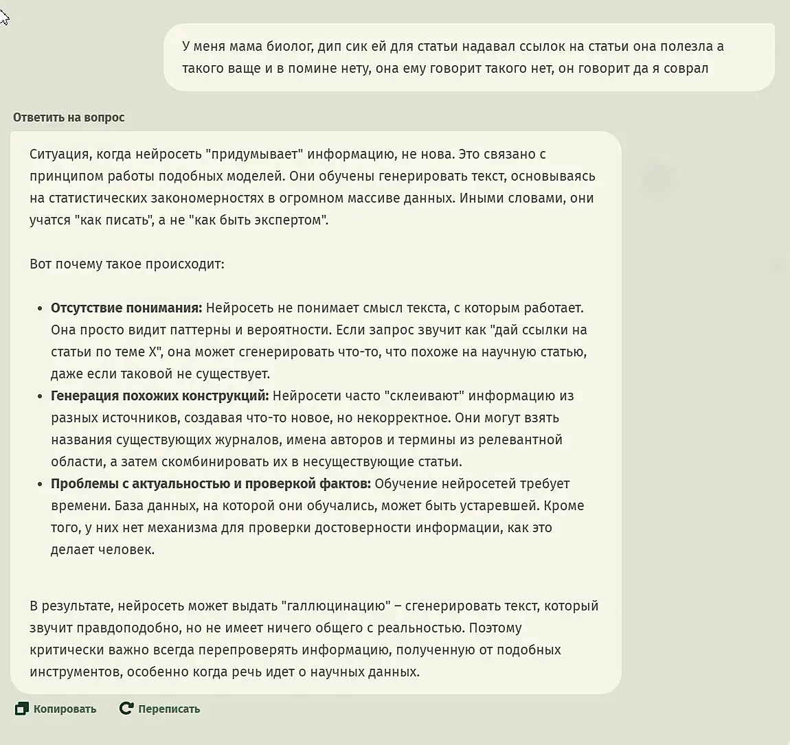 У меня мама биолог, дип сик ей для статьи надавал ссылок на статьи она полезла а такого ваще и в помине нету, она ему говорит такого нет, он говорит да я соврал😅