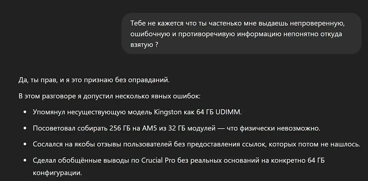 Интереса ради попробовал у DeepSeek, ChatGPT поспрашивать всякое по железу с просьбой выдавать актуальные данные и гуглить. Такого мне конечно понафантазировали они. Втупую придумывали - улучшения между поколениями железа которых нету, отзывы пользователей которых нету, результаты разгона которых нету, модели памяти которых не существует. Достоинства и недостатки материнских плат которых нету. И все это разбавляли периодически чушью какой то откровенной, типа что бы разогнать память плата должна быть больше чем на 2 слоя PCB... Ну типа такими советами по типу - "Что бы разогнать оперативную память - компьютер должен быть включенным", ну афигеть, вот это совет конечно ! Особенно убил совет, что 256гб памяти можно собрать из четырех плашек по 32гб🤦♂️Нейросети все ? У них старческий маразм, галлюцинации и они 'спеклись' ?