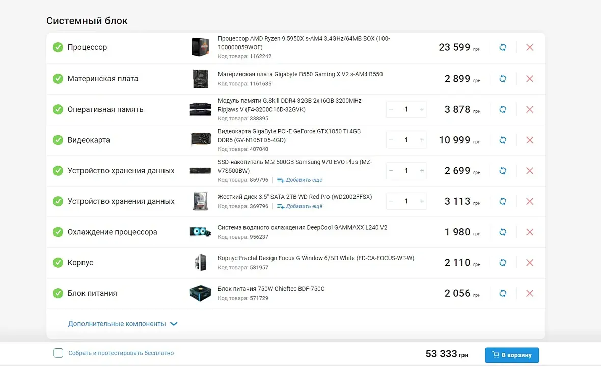 Привет! Гляньте, пожалуйста, сборку. Больше интересует вода и оператива. Хотел crucial, но никак не могу найти на 64. Может ещё где-то неоптимально. Спасибо! Карту для анимации брал, мб и тоже не лучший вариант из 3070?