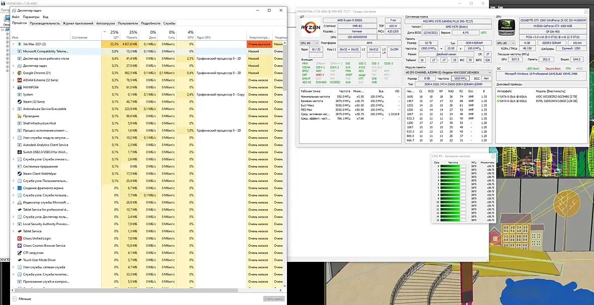 Оперативная память загружена на 34 % (10,8\31,9) диски загруженны на 0 % win 10. corona 9. max 21