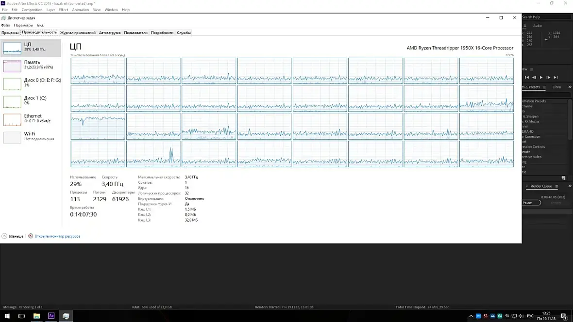 Я ежедневно в After'е работаю. Превьюшки моментальные, Ray-Traycing быстро обрабатывает. Проц грузится на 30-35% при рендере, нагружает в основном одно из ядер, остальные так себе. Но в целом довольно быстро, если сравнивать с чем либо еще.