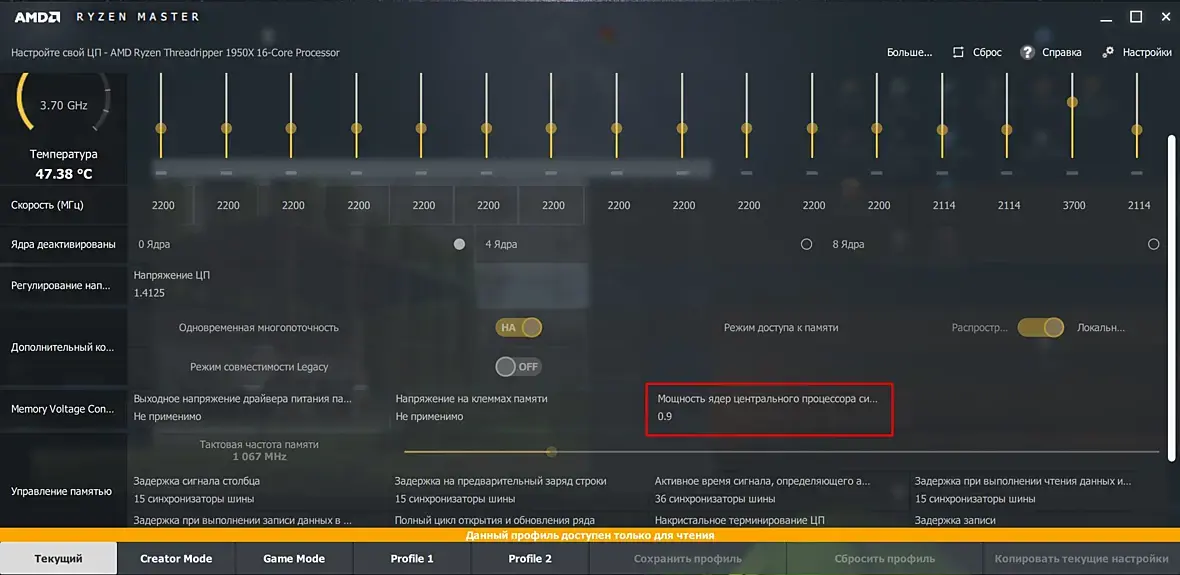 Добрый день, владельцы Средрипперов или знающие люди, поделитесь опытом, нормально ли то, что у меня в AMD Ryzen Master коэфф мощности ядер 0.9 стоит? Проблема в том, что если ставлю 1, то как только начинается рендер комп виснет сразу. Опытным путем пришел к этому показателю при котором стабильно все работает.