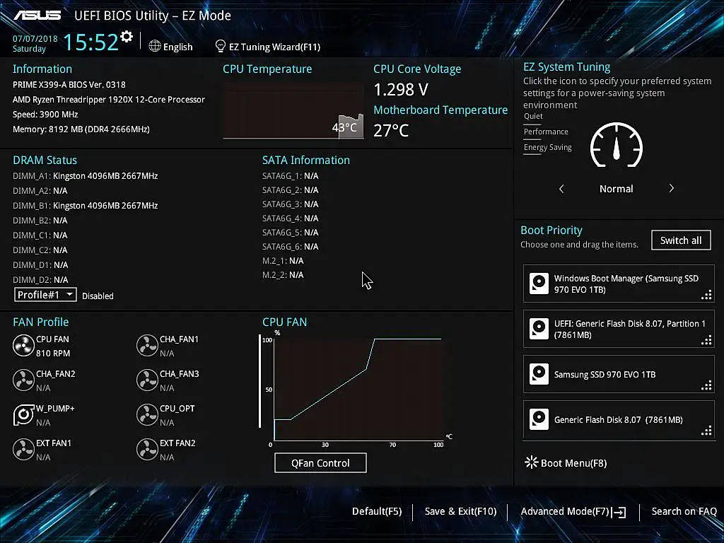 Здраствуйте, подскажите, пожалуйста. Возникла такая проблема. Собрал систему под Threadripper 1920x: Материнка - Asus prime x399-a БП - Seasonic focus plus gold 850W Охлаждение - Enermax liqteck tr4 280 Видеокарта - Asus Strix RTX 2080 Оперативка - G.Skill Ripjaws V, 2x16 (F4-3200C16D-32GVK). К сожалению, при первом запуске компьютер запустился, но все устройства, включая монитор не заработали. Дело было в одной из двух планок оперативки.