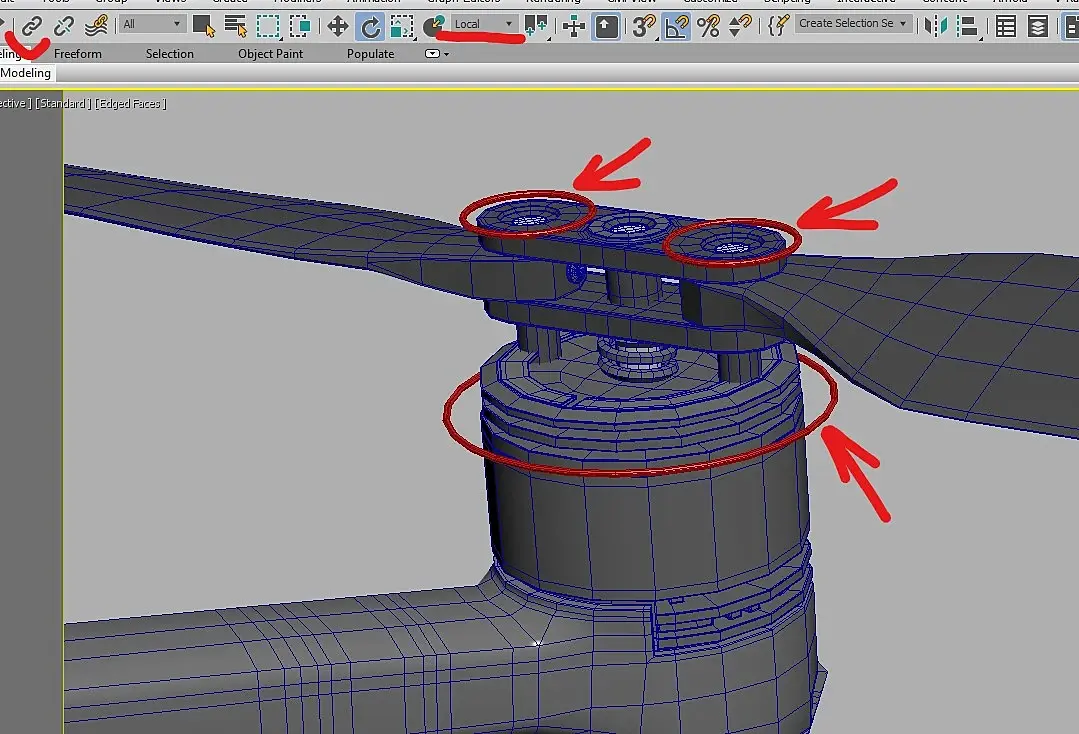 Хочу сделать так, что-бы пользователь смог крутить красные колечки и тем самым вращать каждую лопасть отдельно или весь блок вместе. Есть один нюанс, который все мои потуги поломал - вся эта конструкция слегка наклонена относительно мировых осей. У неё своя ось. Так вот я при помощи select and link привязал все элементы друг к другу и если просто брать за любое из колечек и вращать его в локальных координатах - всё работает! А вот если попробовать всё это анимировать, то в местах где расставляются ключи анимации всё верно а вот в промежутках идёт биение. Как будто он хочет вернуть ось к мировым координатам. Честно не понимаю как это побороть. Может не совсем грамотно объяснил, но думаю что те кто в теме поймут.