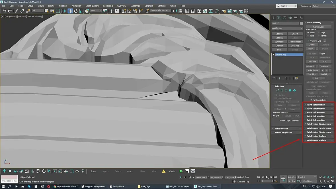 А может кто подскажет почему не работает paint deformation на экспортированной из marvelous модели? Первый раз делала одеяло, надо было именно такое для заказчика, и не совсем разобралась ещё как его равномерно "надуть", в одном месте на сгибе получилось словно там нет наполнителя. Хотела при помощи push/pull чуть вытолкнуть его, но этот инструмент на этой модели работает исключительно на краях почему-то. Может я как-то криво экспортировала модель? Или в чём может быть дело? На других модельках всё работает.