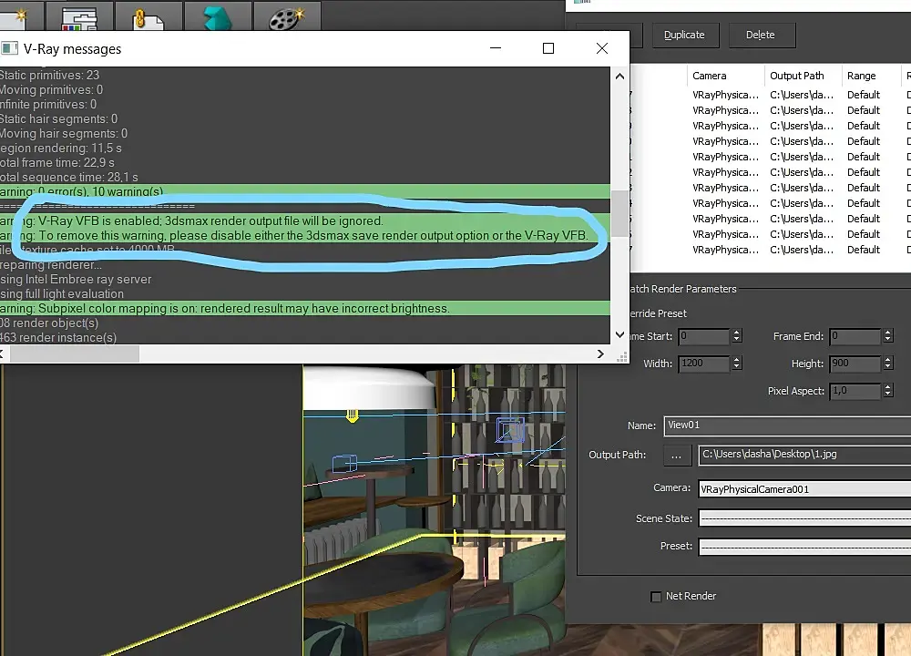 добрый день! помогите, такая же проблема, batch render сохраняет все с одной камеры, добавляет к названию 0000, 3dmax16, vray. Все ранее описанные способы не помогли. может кто-то нашел решение? В ошибках пишет "disable either the 3dsmax save render output", что это значит?