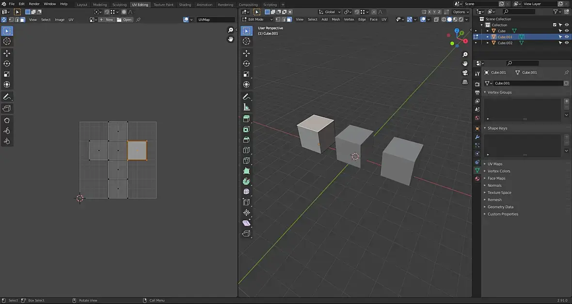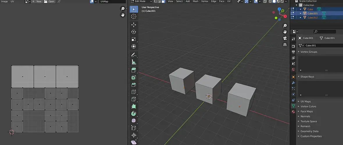 Вот нужно как на втором скрине, только я делал для каждой отдельно модели smart uv по очереди а нужно тоже самое только в один клик выделив все объекты.