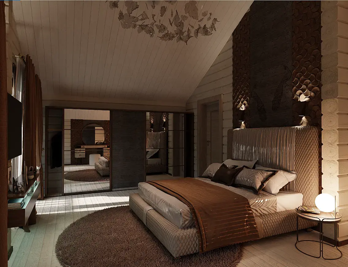 куда ж вы столько полиэтилена на кровать? материал надо точно доработать - выглядит как буд то лпёнкой обтянули, и у покрывала насыщенность цвета приглушить, на полу слишком сильный бамп у дерева - да и немного рефлекта с глосси не повредило бы, плюс с учётом двух окон маловато освещения от окон - может конечно такая задумка, но смотрится как вечер.