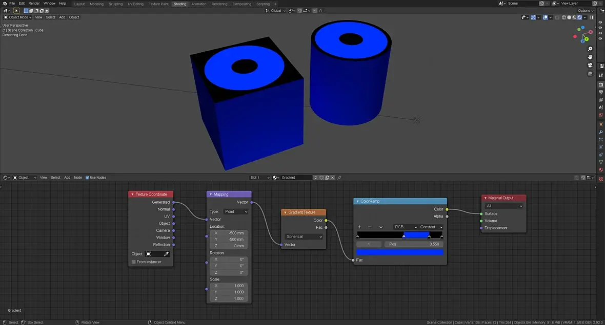 Столкнулся с такой задачей: почему-то эффект Spherical или Quadratic Sphere у ноды Gradient Texture работает с обратной стороны объекта. Обратите внимание на ось координат: фигуры перевернуты кверху ногами.