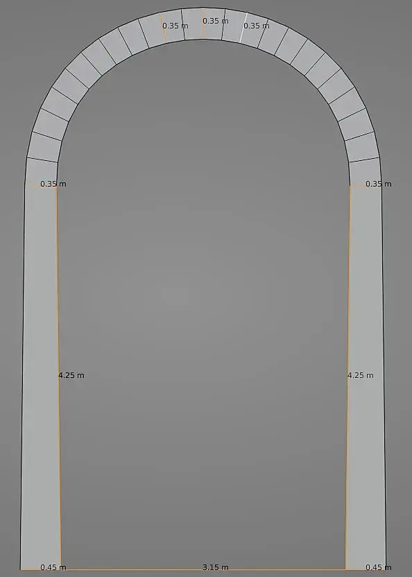 Между колоннами проход шириной 3.15м. Колонны 45см диаметром у основания и 35см у вершины. Высота колонн 4.25м. На колоннах покоится полукруглая арка