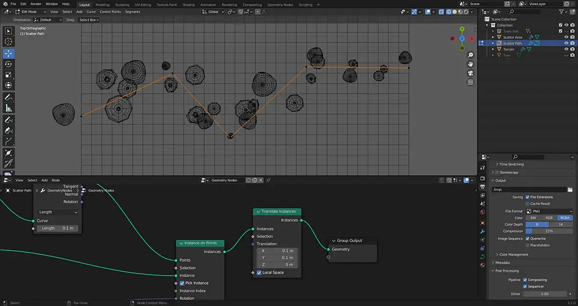 Объекты распределяются по нужной площади или вдоль кривых, при этом приклеиваются к поверхности. Это позволит удобно управлять скаттером на локальных участках, не раскрашивая веса вершин рельефа.