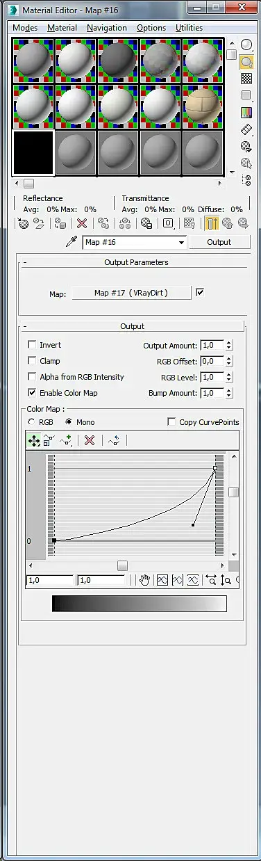 Но по приведённой в начале поста картинке я бы не стал заморачиваться с дёртом, т.к. он сильно тормозит комп.Там у вас и полутоновых переходов-то, по сути, нет. Просто разделить материал по группам - блестящий и чёрный, сделать мульти-суб материал и накинуть на этот объект.