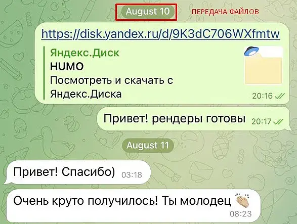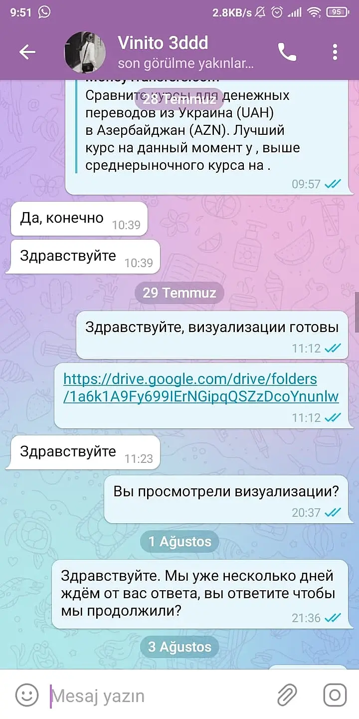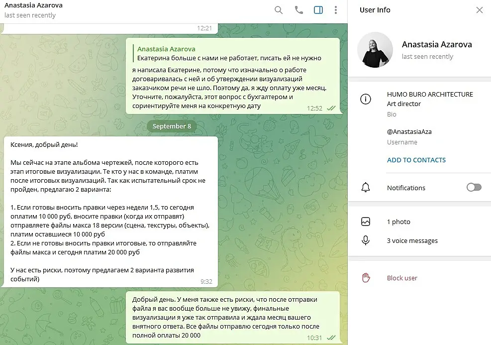 10/08/2022 я передала ссылку на финальные визы архитектору, ей все понравилось, мои визы выложили в соцсети бюро. Далее начались отсрочки с оплатой работы, якобы заказчик не мог посмотреть и согласовать визы. Со мной начала в хамской манере общаться арт-директор бюро, требовать помимо визов прислать все мои рабочие файлы. Я обозначила готовность прислать все после полной оплаты. На сегодняшний день я так и не получила деньги. Наше общение закончилось угрозами арт-директора привлечь меня к ответственности за клевету и использование их интеллектуальной собственности.