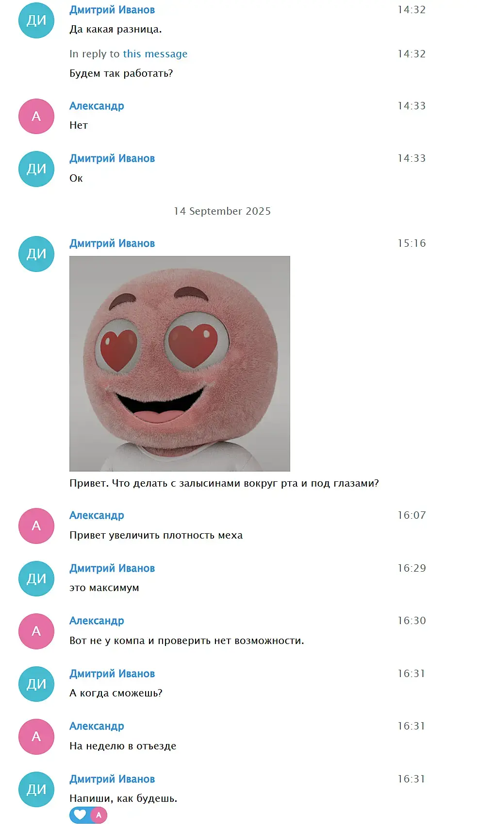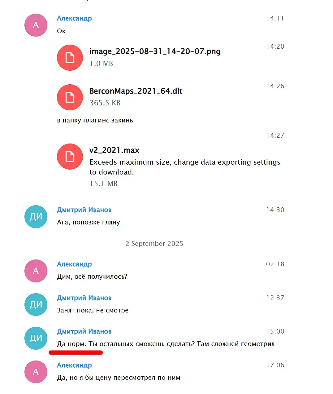 14 сентября заказчик скидывает мне картинку с проблемой по модели.  Это прошло 12 дней со дня принятия работы. За этого период ни слова от него не было. Но ок, я сказал что нет возможности, в отъезде, буду через дней 7. По факту в больничке лежал в стационаре. Договорились что он подождёт. Всё это вы сейчас ниже видите на скрине переписки.