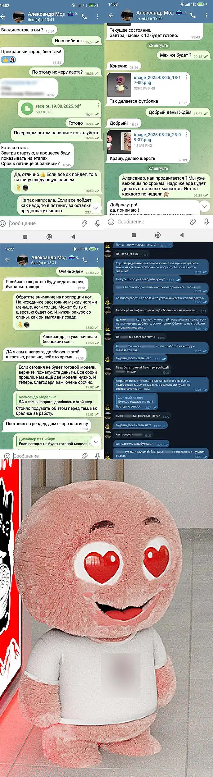 Нужно было сделать трех максотов. Гражданин взялся делать, договорились начать с одного. Срок заявлен три дня, предоплата выдана. Дальше 10 дней постоянных переписок, отписок, болезней, командировок. Гражданин выслал скрины, на которых было все ок, работа оплачена. По факту модель оказалась с залысинами, гражданин обязался исправить, но две недели после этого очень сильно занят/болел/уехал, по итоге остались с одной недоделанной моделью.