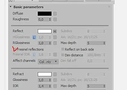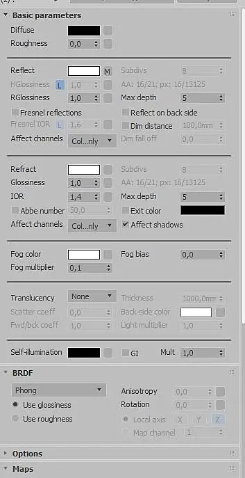 А если воткнуть стекло в новую сцену и создать заново материал двигаясь по каждому пункту. Т.е. сначала черный диффуз, потом рефлект на полную, затем рефракт.