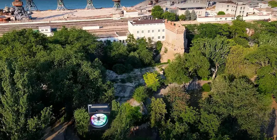 А в той выступающей будочке стояла аппаратура и стояли столбы с разноцветными лампочками на "веревках" между столбами. Было темновато но сияло все как на титанике