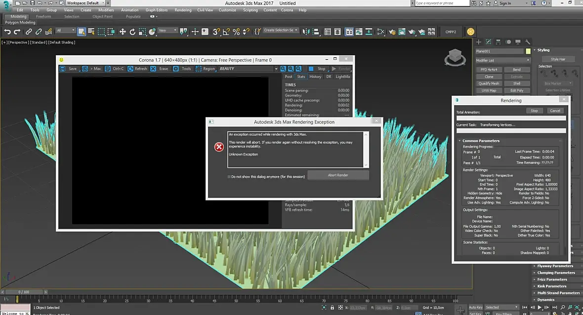 Друзья приветствую. Поставил Корону 1.7 создал ковёр с помощью plane и hair and fur. Нажимаю на рендер он вот это выдаёт. Если нажимаю на интерактив то вообще вылетает( Никто не встречался с этим? причём только на этом модификаторе(