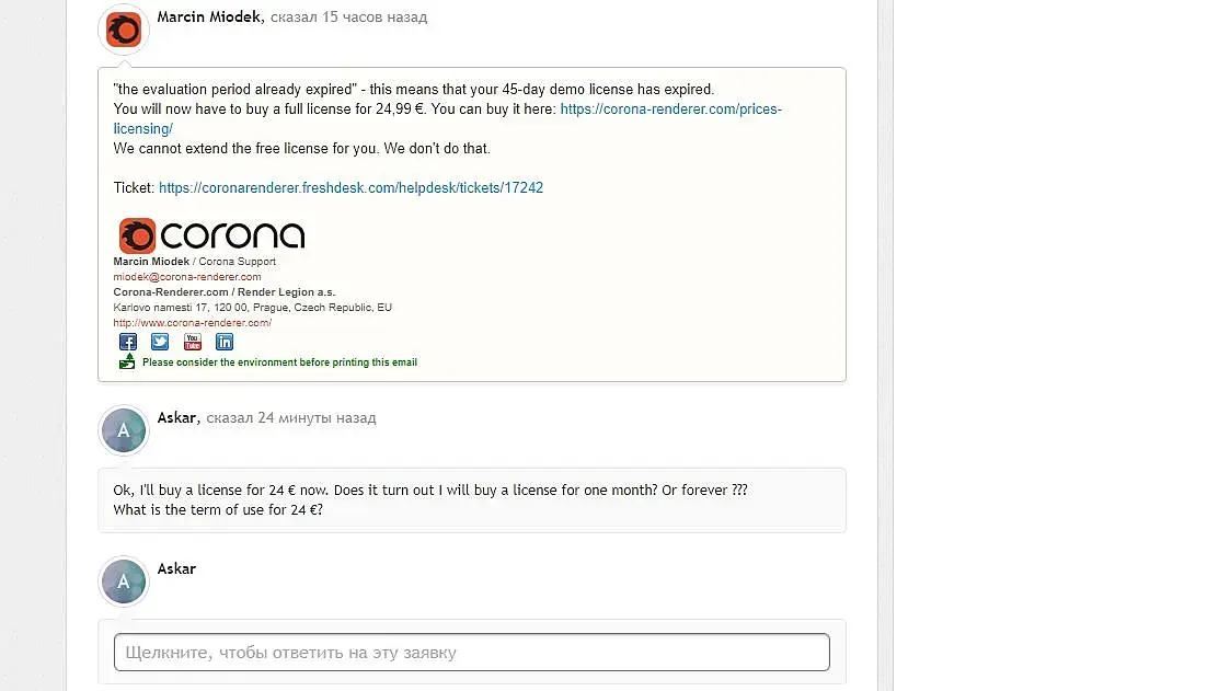 В сообщениях говорят (Теперь вам придется купить полную лицензию за 24,99 €. Вы можете купить его здесь: https://corona-renderer.com/prices-licensing/ ) Это означает только один раз ее куплю на всегда ? Или 24,99 € - это за 1 месяц ?