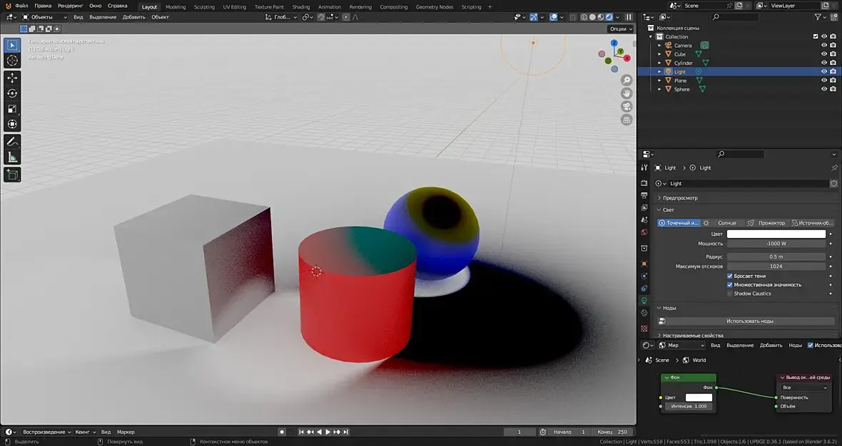 В блендер, и у циклов, и у евы, есть свет наоборот, просто поставить отрицательные значения мощности источнику света. АААааа, спасите мои глаза. Если что, шарик синий, а цилиндр красный. Возможно наверное получить и более причудливые эффекты, но я тоже не понимаю что нужно.
