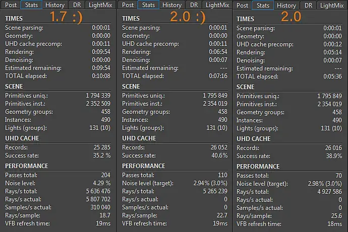 мне тоже 2-я не понравилась,но это мое субъективное мнение, тестировать на разных сценах у меня времени нет. руководствуюсь недавним опытом,делал санузел выставил noise limit 3% и 2-я отрендерила дольше чем 1,7 да еще и шума больше. на 1,7 при noise limit 5% шума и то меньше чем на 2-ой при 3%