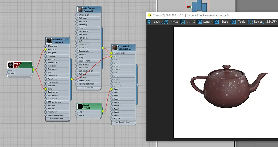 Если затолкать карту бампа в CoronaBumpConverter, то она на втором слое начинает работать. Уже получше будет. Первый чайник с CoronaBumpConverter, второй - без: