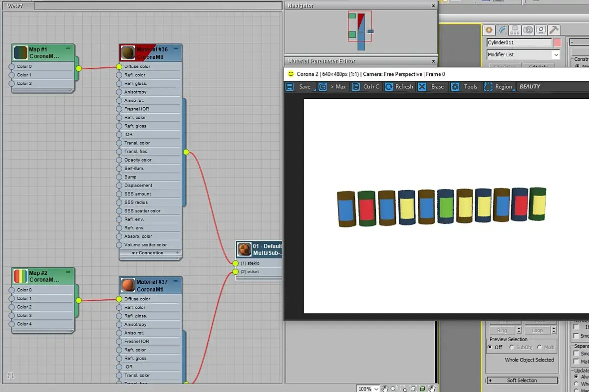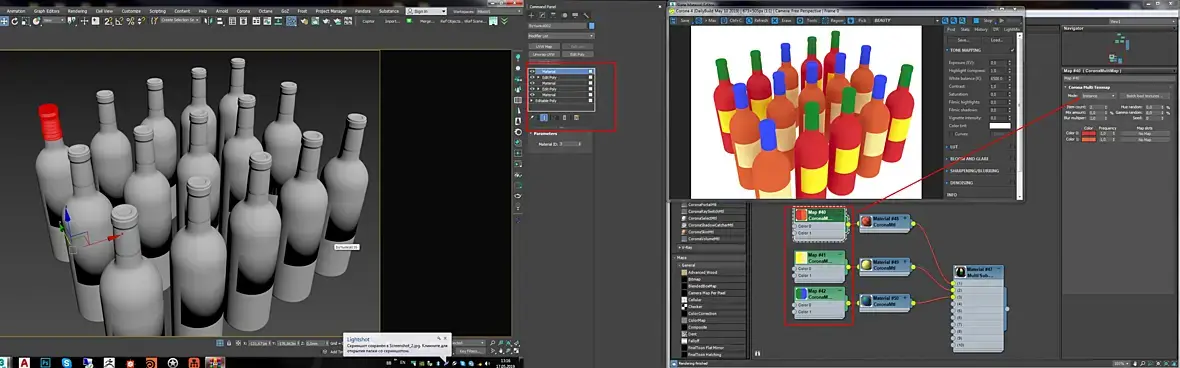 Привет всем!Вопрос такой: есть бутылка с тремя материалами - горлышко, стекло и этикетка, идея в том, чтобы скопировать ее в кол-ве штук 100 и применить на каждый из перечисленных материалов свой CoronaMultyMap, т.е. стекло чтобы было разных цветов, горлышко и этикетки.