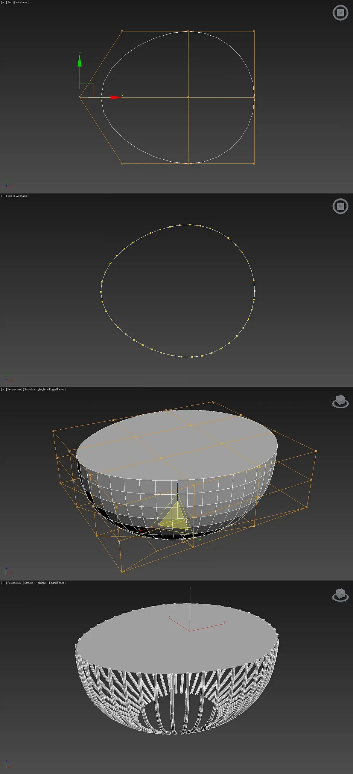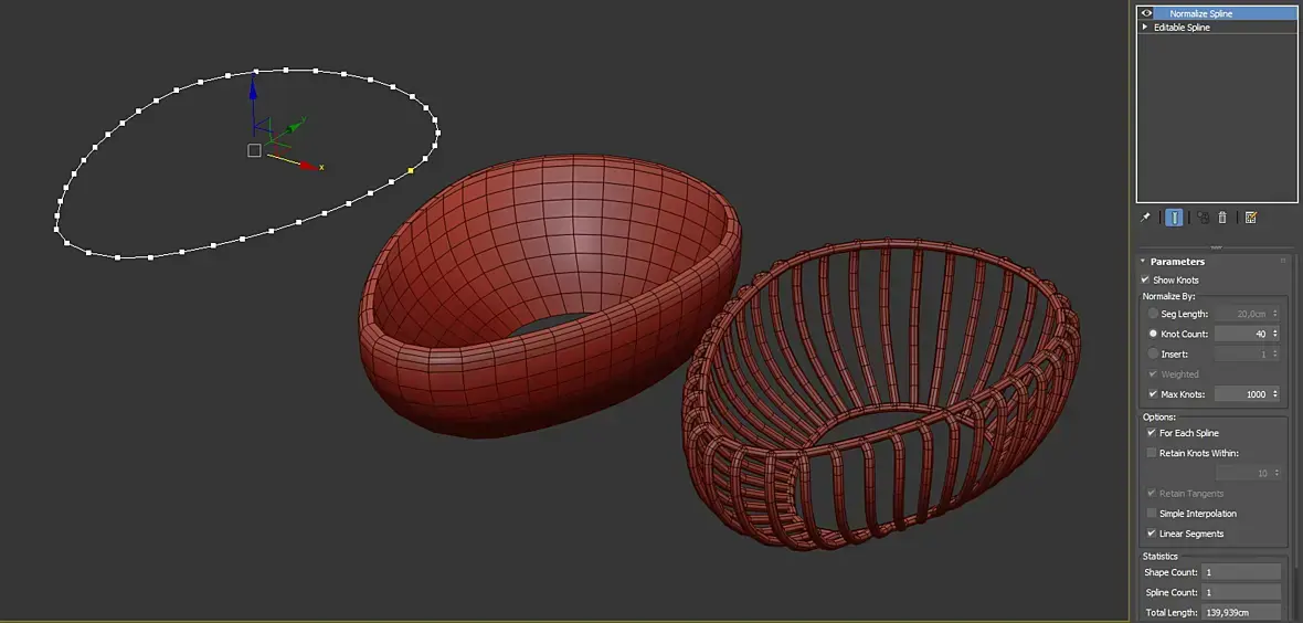 Если вы знали, что надо будет делать это из прутьев, можно было бы заранее из сплайна начать моделировать форму, предварительно накинув Normalize Spline. Тогда рёбра были бы на одинаковом расстоянии (в моём случае сверху).