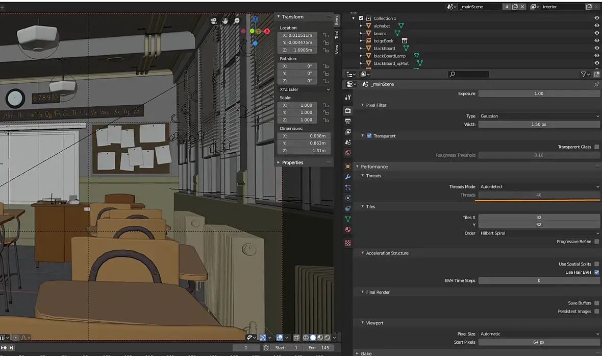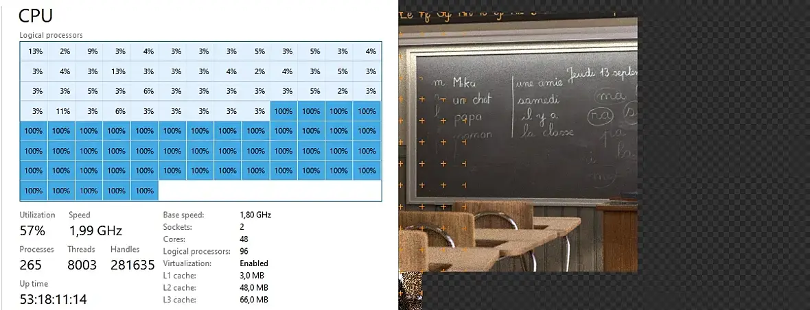 reightar я запускал на двойных платинумах, 1 проц загружен полностью, второй по нулям, возможно у него лимит по количеству ядер/потоков, у меня на машинах по 96 потоков, в настройках пробовал вручную задать 96, но это не помогло, версия блендера последняя с сайта, на тест запускал сцену classroom, при автодетекте видит только 48 потоков из 96, да еще и частоту режет при рендере, в том же вирее частота при рендере 2.2