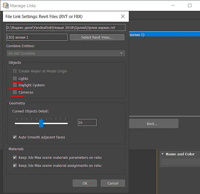 Наверно удобнее всего отменить импорт этой света в начале. А подскажите пожалуйста, как вот эта вкладка открывается? У меня при импорте предлагает параметры объекта настроить, тоесть оставлять ревитовские материаоы или нет и тд. А этой вкладки нет, но может быть я не внимательно смотрю? Буду очень благодарна.