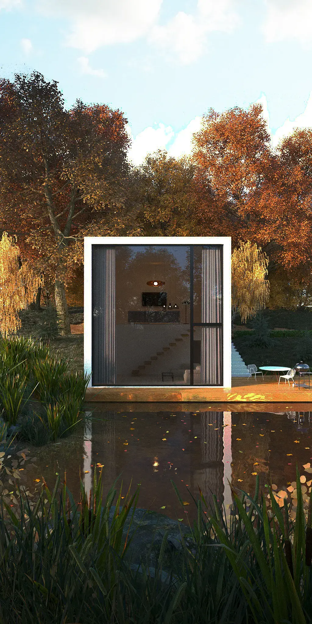 я что то с масштабом ничего не могу понять вроде на переднем плане все большое трава пруд только Вот сам объект (стулья, здание,) смотрится очень мелко. С масштабом надо поработать.