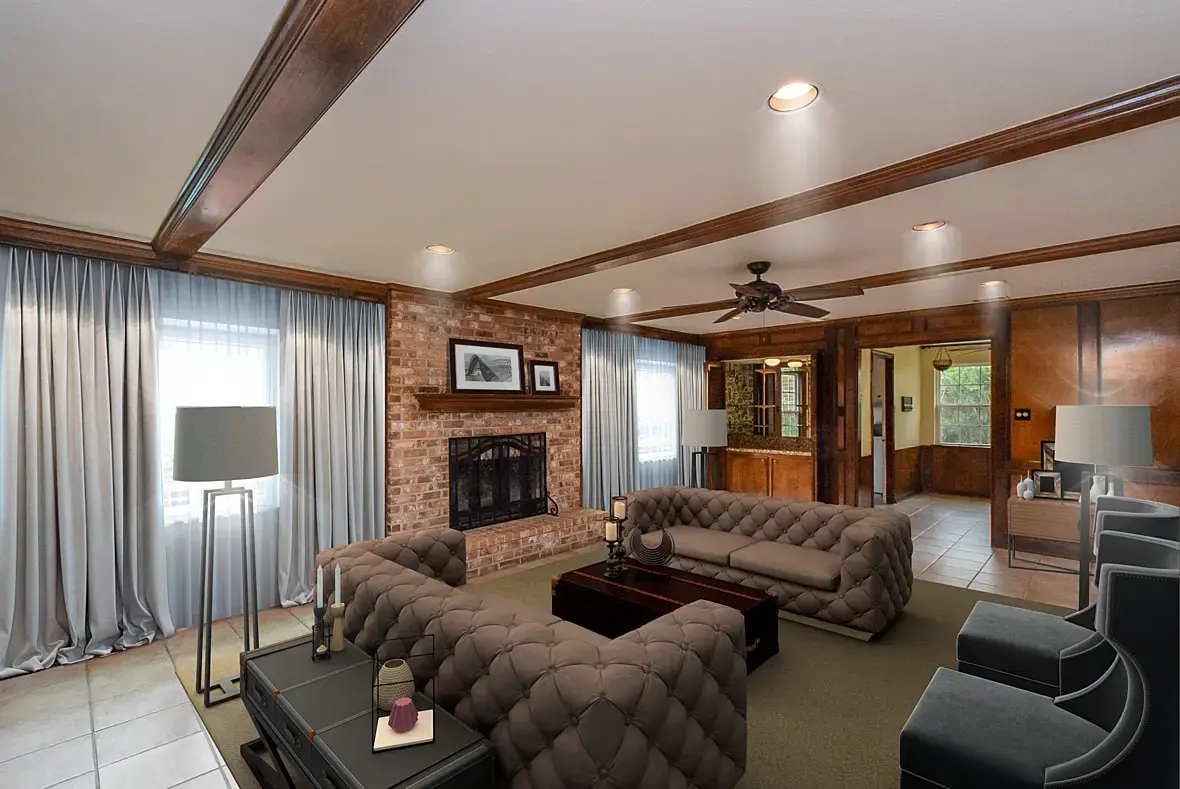 Свет невнятный, попробуйте его выключить (верхний), теней нет совсем, все выглядит плоско. Оставьте торшеры и свет из окна. Торшеры "зажгите" теплым светом.