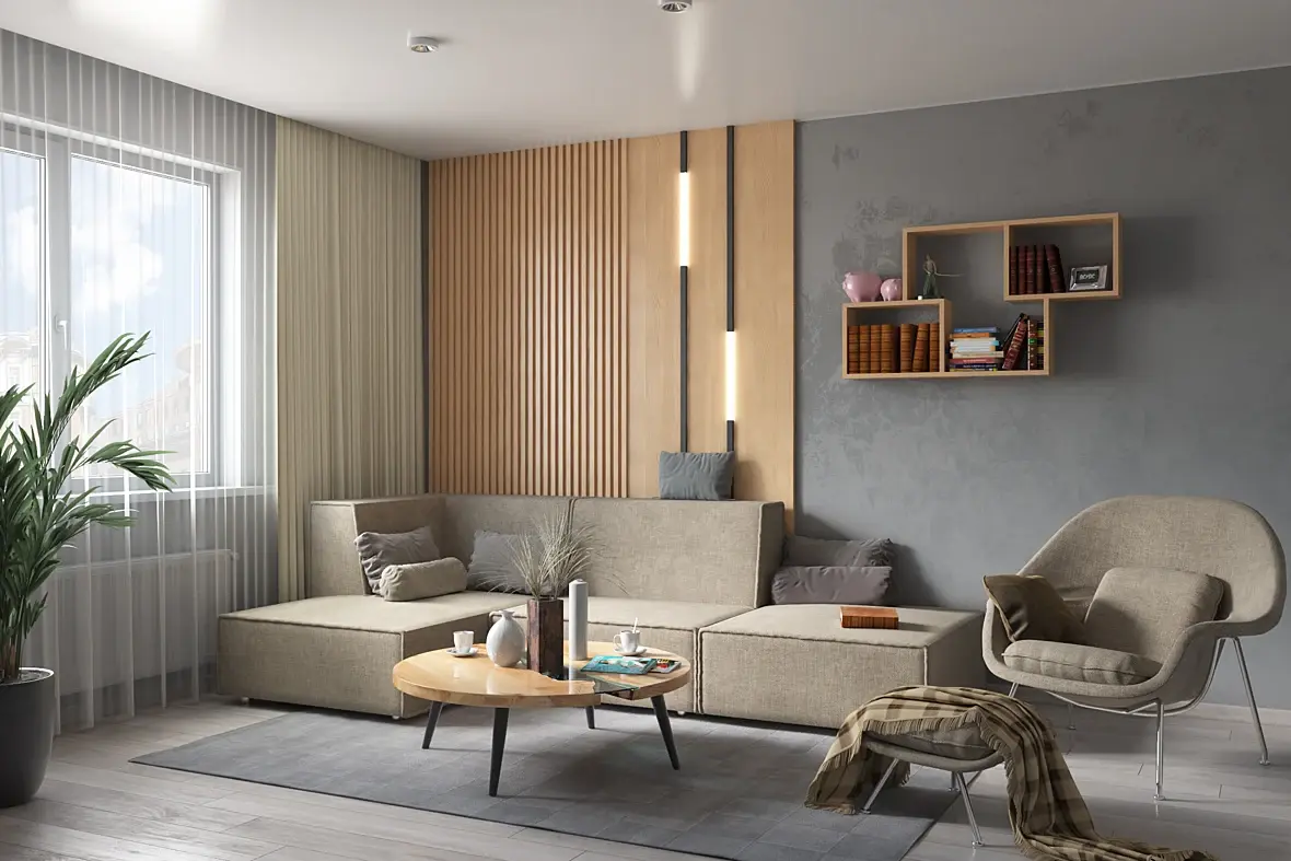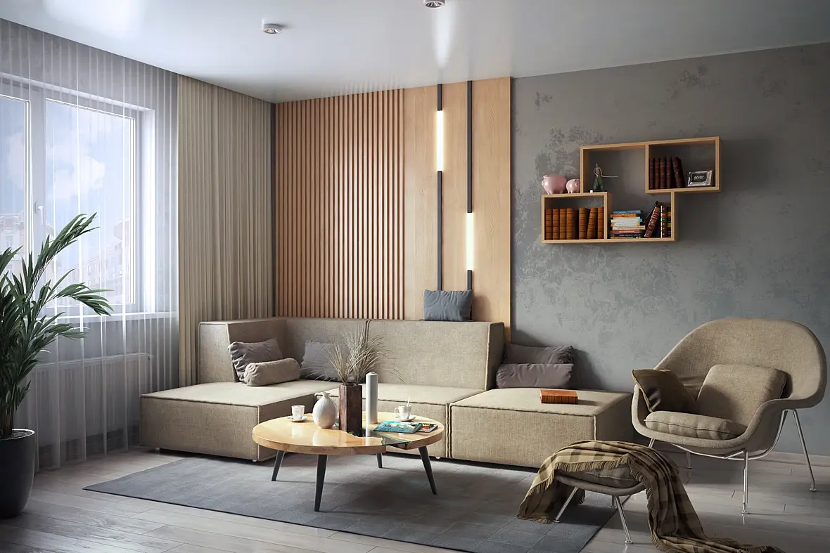 свет из окна, что-то с ним не так вышло, может с матом тюли что-то не так. для тестирования своих навыков, попробуй поиграться с освещением прям в этой сцене: сделать закат, вечер, ночь! в остальном, без дизайна вполне себе хорошо вышло. про бек за окном уже сказали