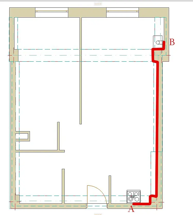 Планировка с асимметричными балками От точки А до точки Б должна пойти газовая труба , через гостиную. Только дизайн потолка особенно в области балки рядом с котлом не как не получается. Может кто то сталкивался с такой проблеммой , котел не можем поставить на кухне, и так очень мало места..