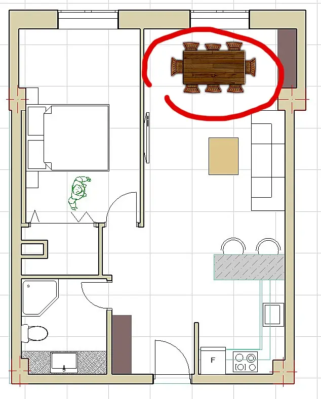 кухню вернуть на место, а спальню в гостинную, стену перенести вправо. А гардероб туда где у вас кухня.