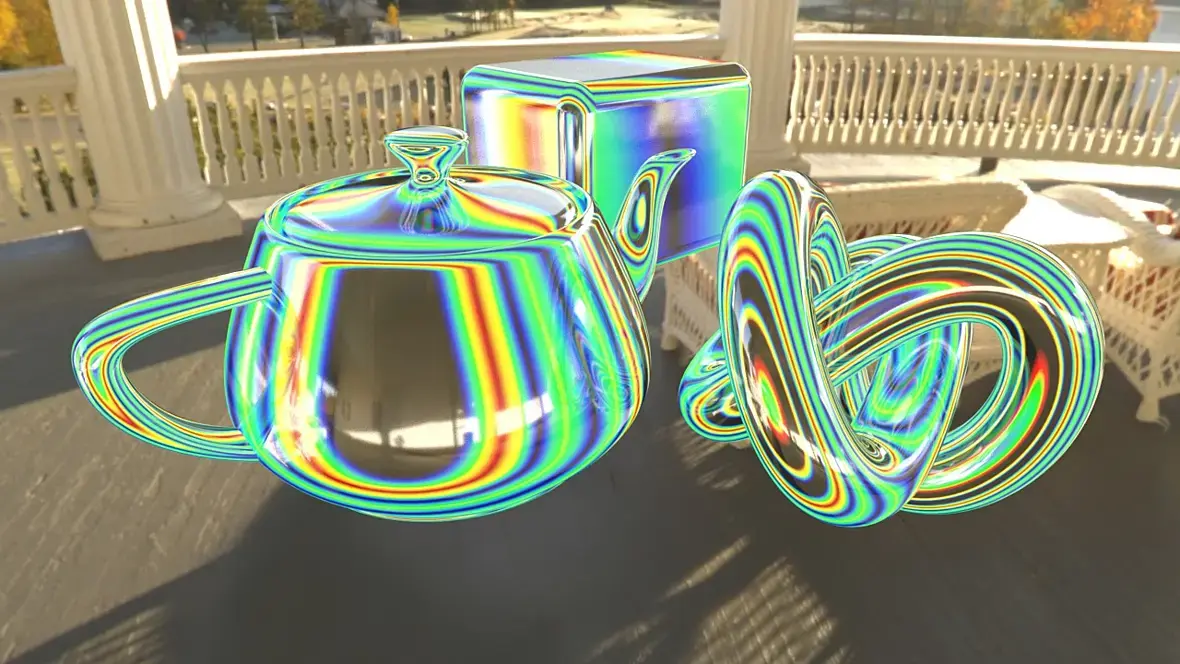 это иридесценция, и цвет меняется не только от угла обзора но и от угла освещения, в короне пока что можно только углом обзора делать градиенты. Октан и другие спектральные рендеры куда лучше сделают.