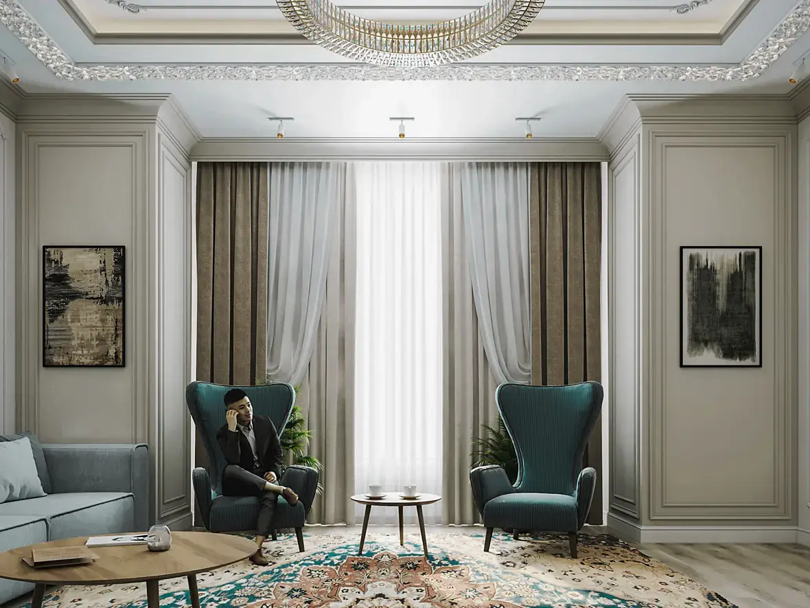 если по визу, то текстура ковра обрезана, пол странный , текстура штор крупновата, несоразмерность человека и кофейных чашек, по композиции у вас левая сторона перегружена, я бы пересадила человека и убрала картину, страницы книг украли