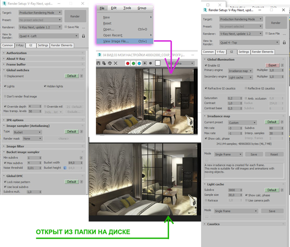 Всем знатокам доброго дня! Давно не могу понять, может кто-то подскажет почему искажается цвет картинки? и можно ли как-то с этим бороться в настройках 3D МАХ? выкладываю скрин. V-3ds Max 2020 + V-Ray Next 4.10.03. Верхняя картинка открыта из программы, отображается также, как и на рендере. Все ок. А нижняя открыта из папки с диска. Один и тот же файл так отличается по цвету и по контрасту. Меня интересует именно цветопередача. И дело не в гамме. А в чем ? Получается сидишь, выстраиваешь все, рендеришь, сохраняешь, а потом открываешь и упс(((. И еще много лишних движений приходится делать в фотошопе. Кто-то если знает, в чем дело, поделитесь, пжста 🙏