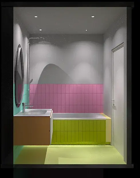 в жизни при таком размещение, так и будет тень, прекращайте фейковать. оставь две точки у раковины и входа, а вдоль стены ванны- диодная подсветка по длинной стенке ванны