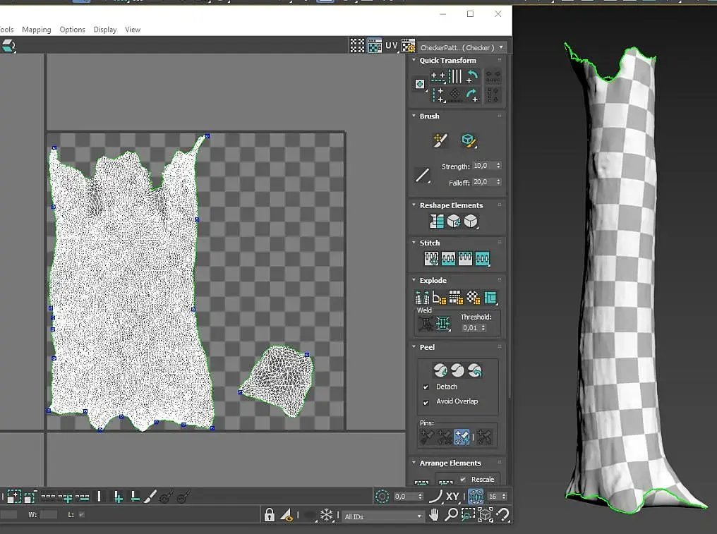 Peel режет модель по швам. Чтобы развернуть такую модель, достаточно сделать Mapping - flatten mapping.