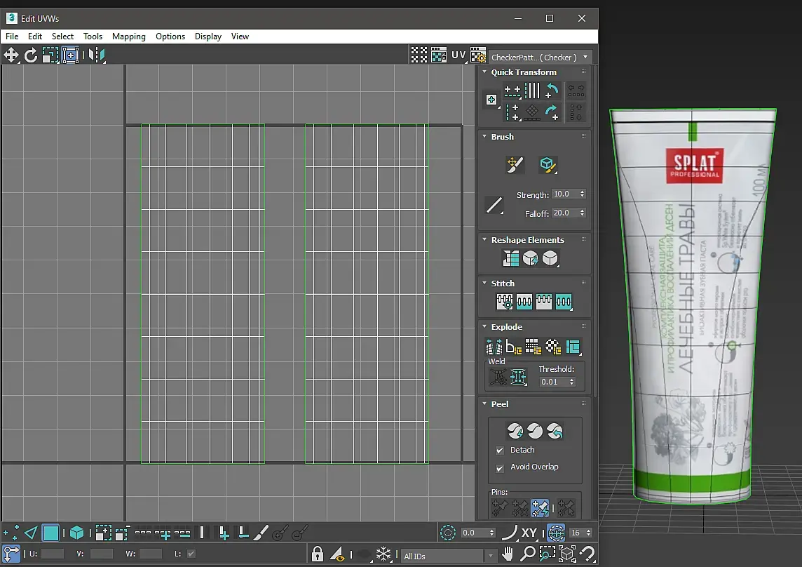 В идеале, как понимаю, надо сделать один разрез, чтобы получился один кусок, который как бы обволакивает всю поверхность тюбика....но как сделать так, чтобы все полигоны на сколкьо это возможно были Не искажены в своих пропорциях?